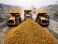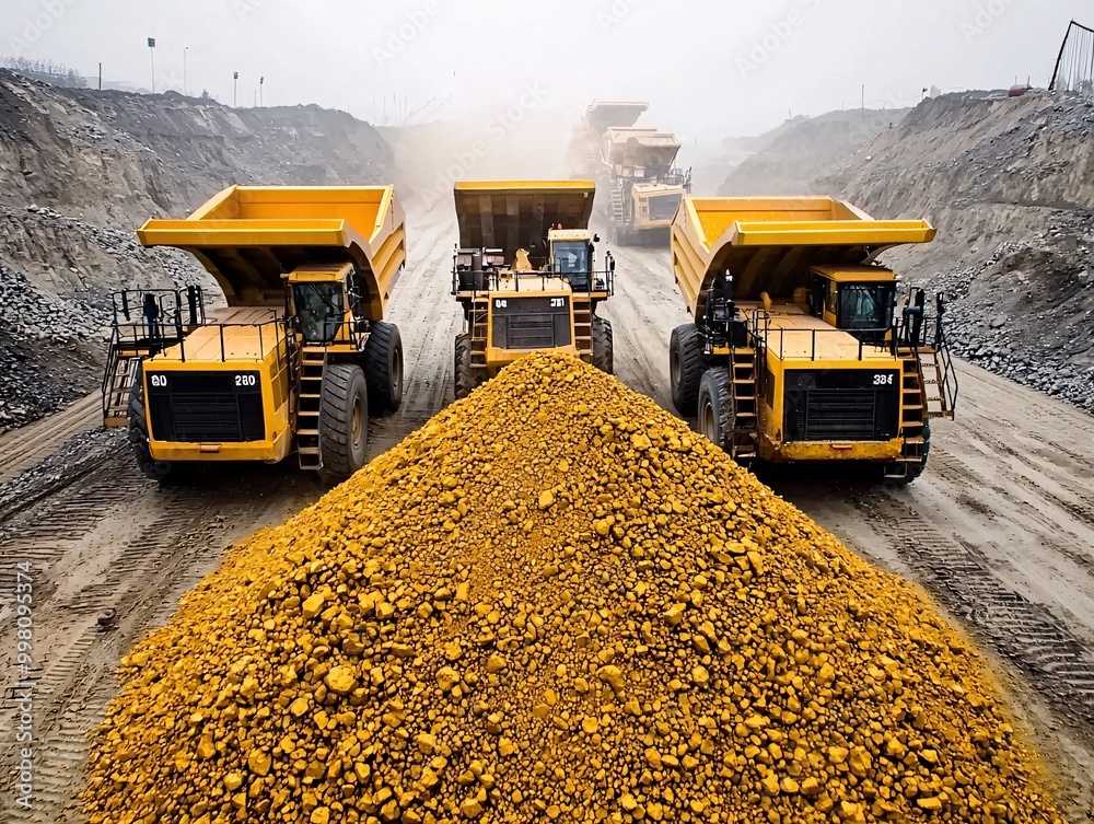 Modern day mining operation, massive machines digging into the earth, piles of raw gold ore shimmering under the harsh sunlight" #998095374