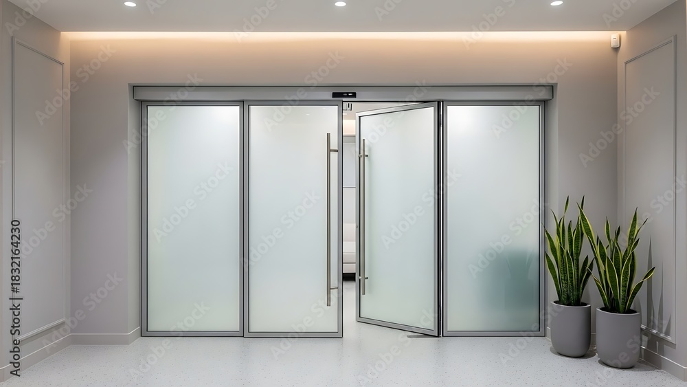 • #1832164230 Modern frosted glass automatic doors in a contemporary office building.