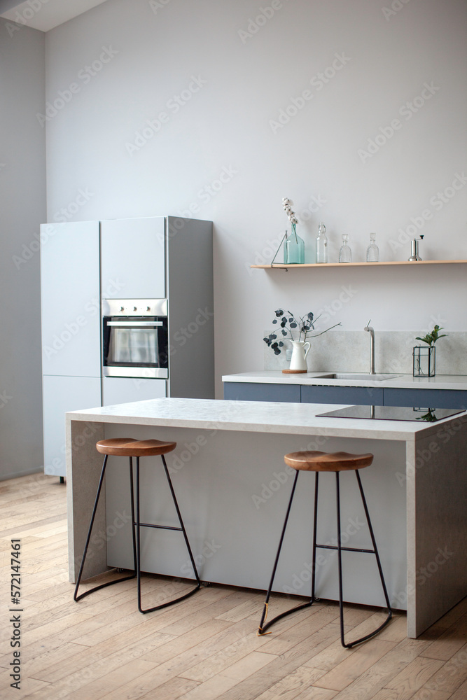 Modern kitchen interior in scandinavian style and gray tones. #572147461