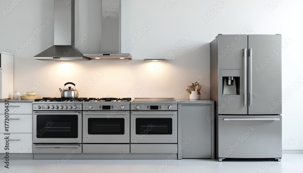 Modern kitchen sleek stainless steel appliances. Large refrigerator, freezer with water dispenser. Gas stove, double ovens, range hood visible. Home interior design shows contemporary style, clean, #1773070437