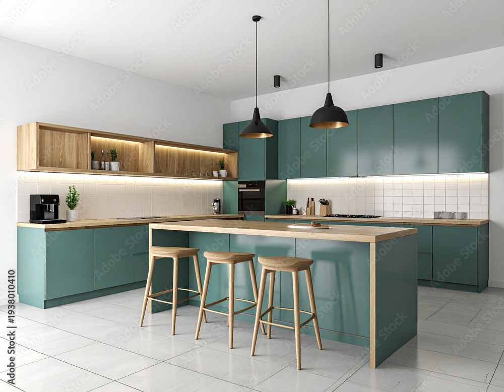 Modern kitchen with teal cabinets, wooden accents, island with stools, and pendant lights #1938010410