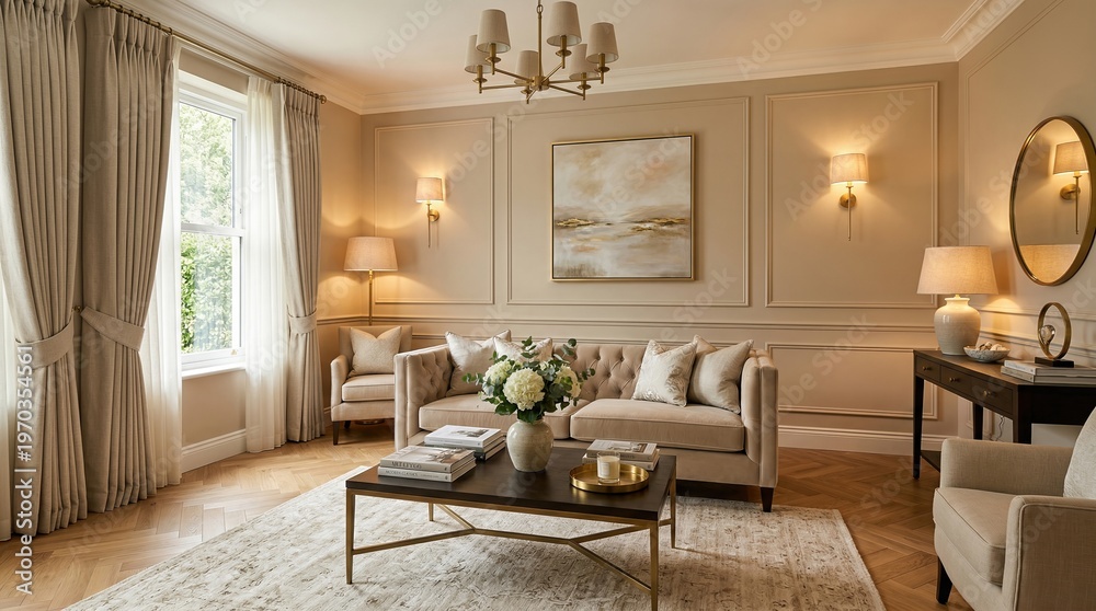Modern living room interior with beige sofa and neutral decor. Elegant contemporary design featuring curtains, lamps, abstract painting, and vase of flowers. Stylish home furnishing concept for #1970354561
