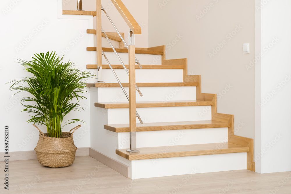 Modern natural ash tree wooden stairs in new house interior #358733210