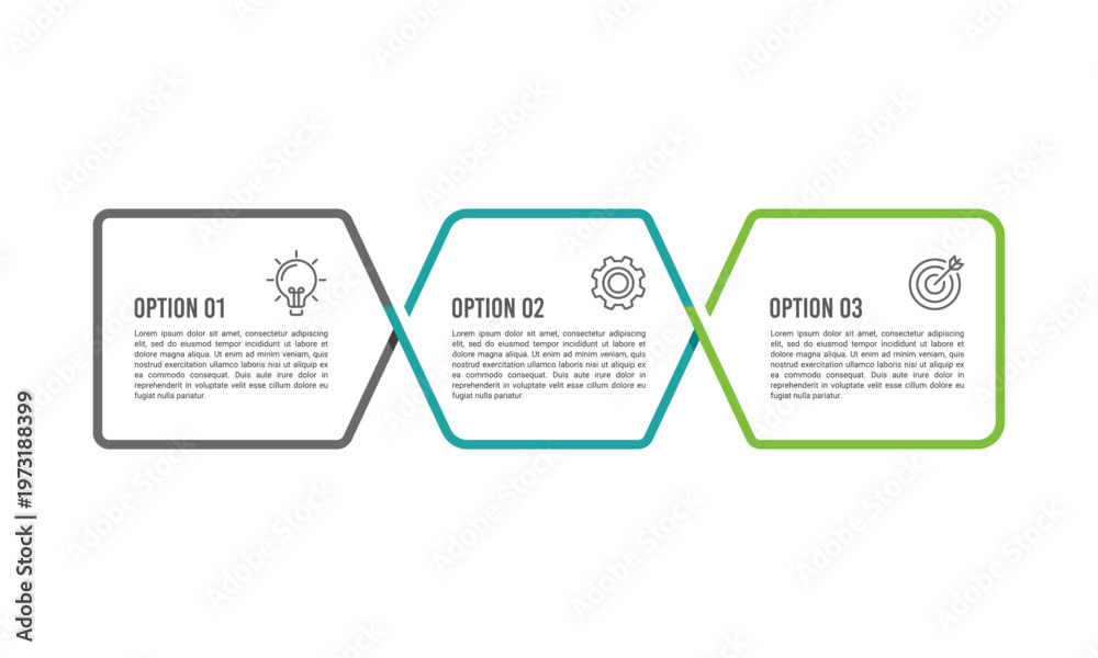 Modern 3 options infographic template with linked hexagonal shapes for business process. Vector illustration. #1973188399