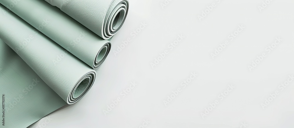 Modern pastel grey green yoga mat rolled on a white background with a minimalist design creating a serene copy space image #887782076