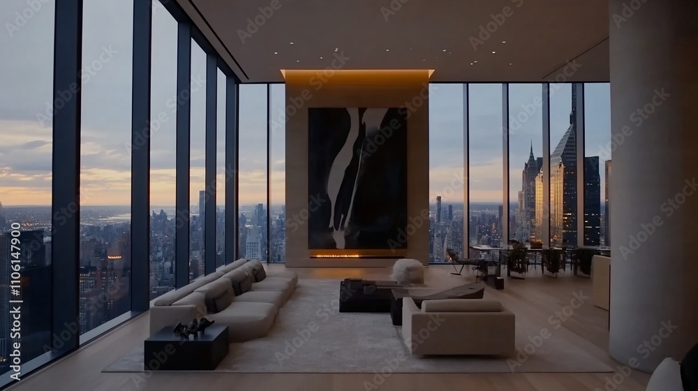Modern penthouse living room with city views. #1106147900