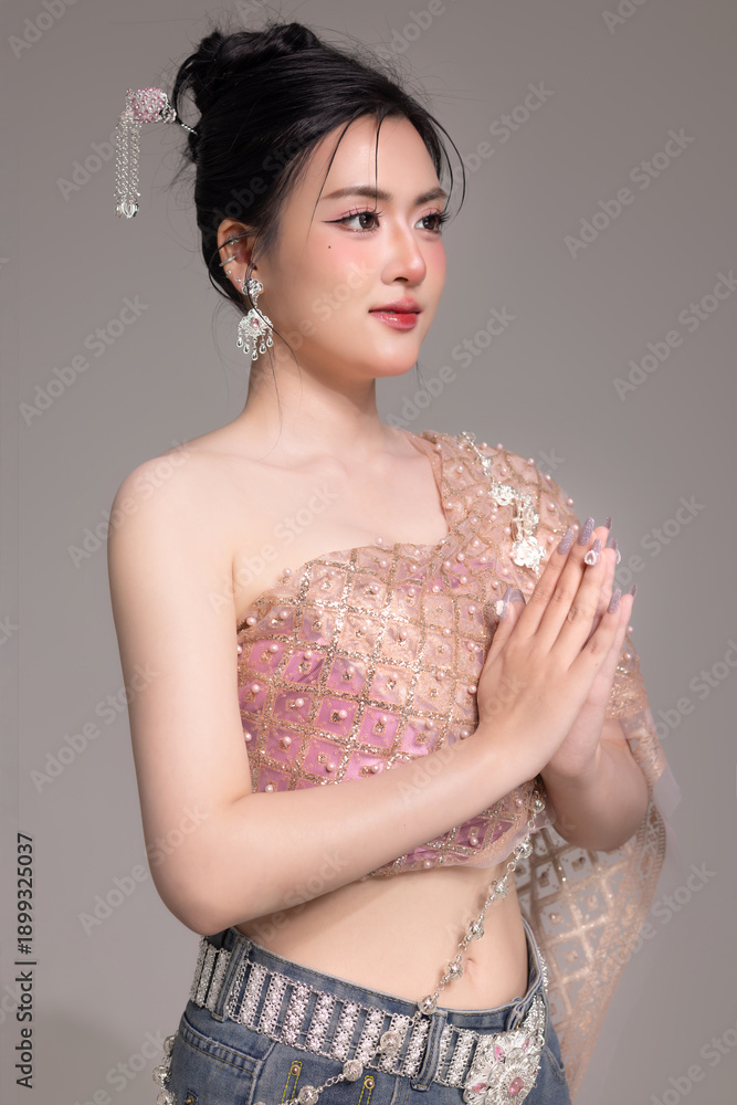 Modern trendy Thai fashion woman wearing a traditional Sabai paired with denim jeans, reflecting the growing fashion trend in Thailand that blends cultural heritage with contemporary street style. #1899325037