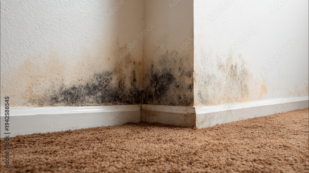 Mold growth is visible on the corner walls above the baseboard in a room with brown carpet flooring. #1942588545