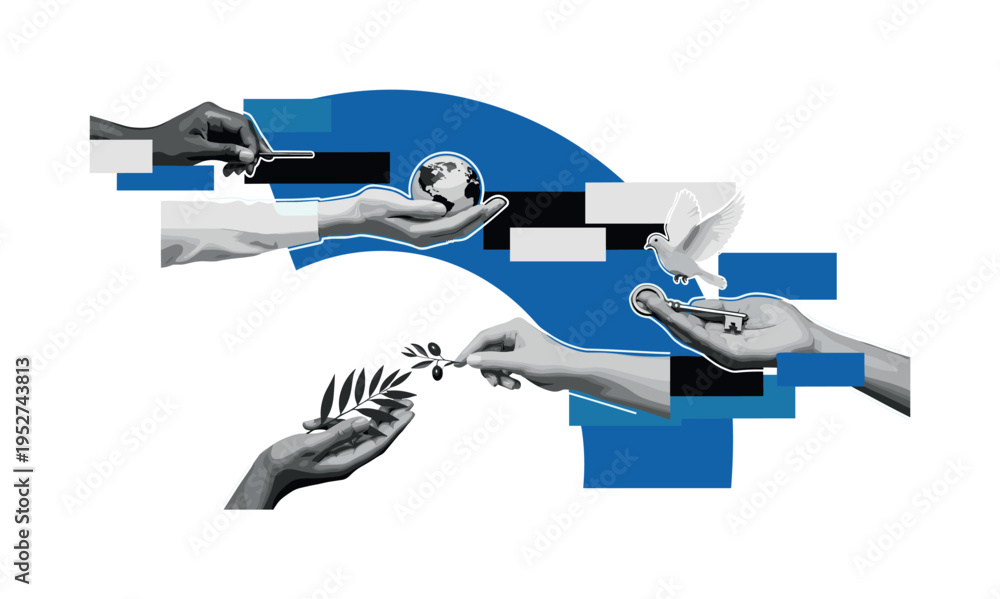 Monochrome close-up of hands from different cultures holding symbolic objects, intersected by a large blue semicircle and abstract rectangular blocks #1952743813