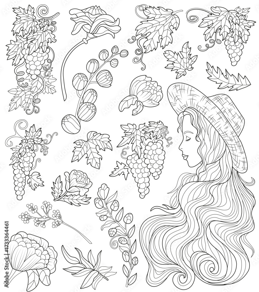 Monochrome design set with grape berries, leaves, flowers, floral elements and beautiful girl. Vector line art illustrations for clipart, stickers, coloring book isolated on white background. #1733364461