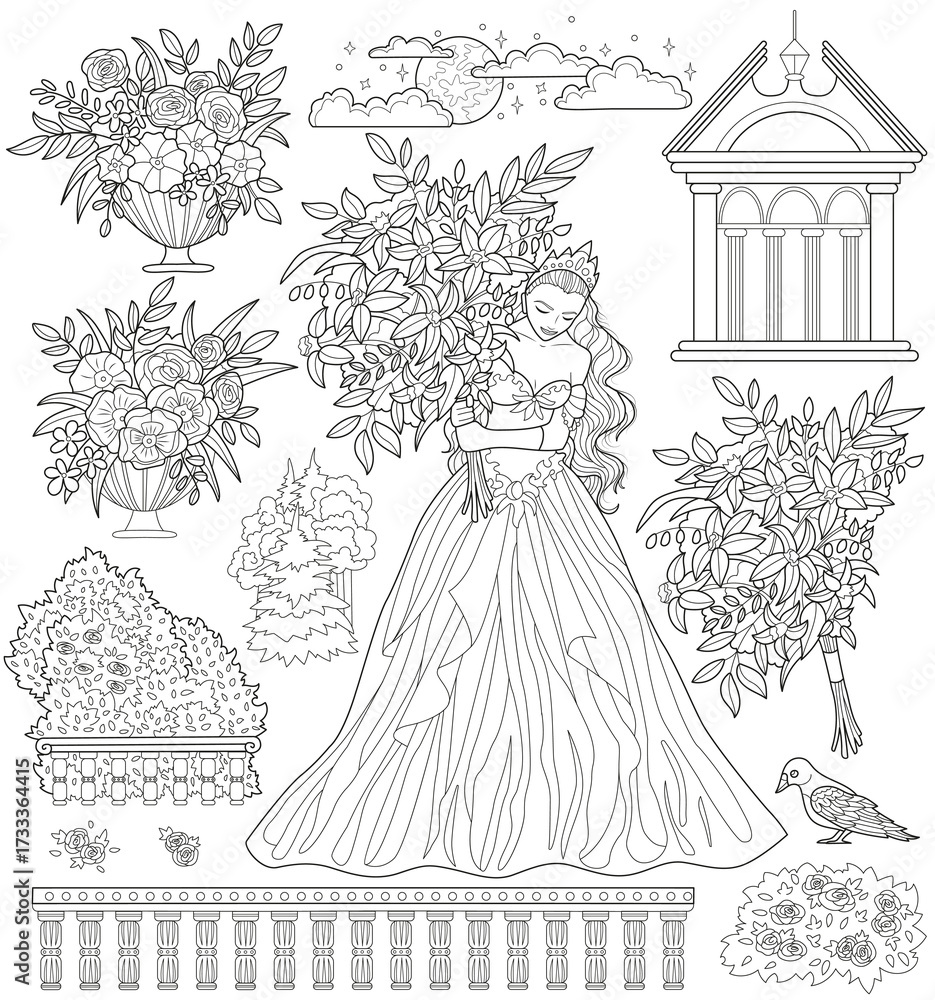 Monochrome fantasy design set with beautiful princess, flowers, castle, floral elements. Vector line art illustrations for clipart, stickers, coloring book isolated on white background. #1733364415