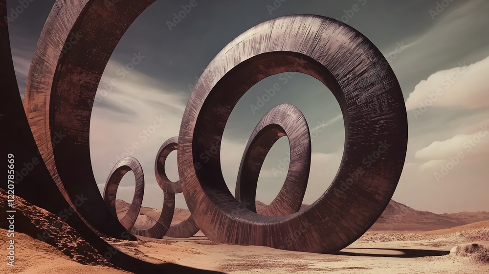 Monumental architectural sculpture featuring spiral geometric industrial installation artistic desert landscape dramatic contemporary minimalist architectural curved composition #1220785669