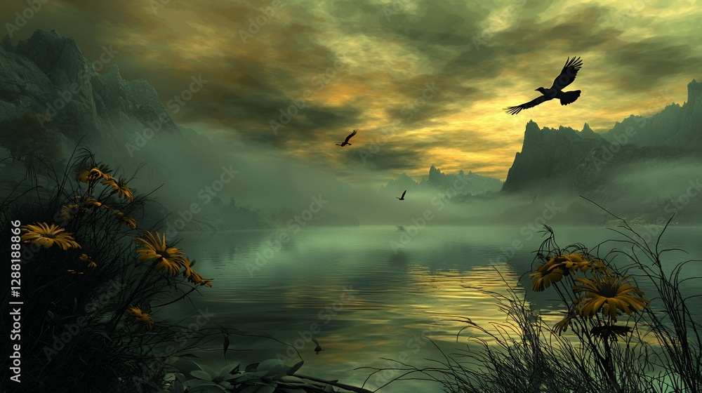 Moody Dark Landscape with Misty Lake and Flying Birds at Sunset #1288188866