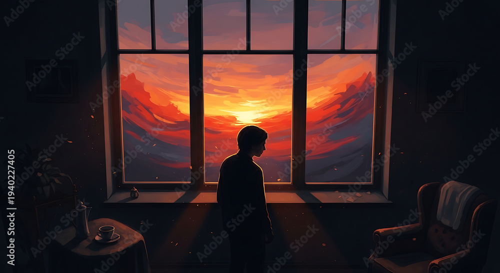 Moody silhouette of a solitary figure peering through a glass window at a vibrant abstract sunset, capturing themes of isolation, quiet reflection, and profound longing in a conceptual art style. #1940227405