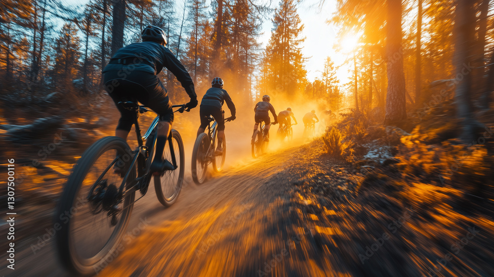 Mountain Biking in the Sunset Forest – Athletes in protective gear tackle challenging mountain trails on their bikes, their silhouettes disappearing into the golden light and rising clouds of dust.. #1307500116
