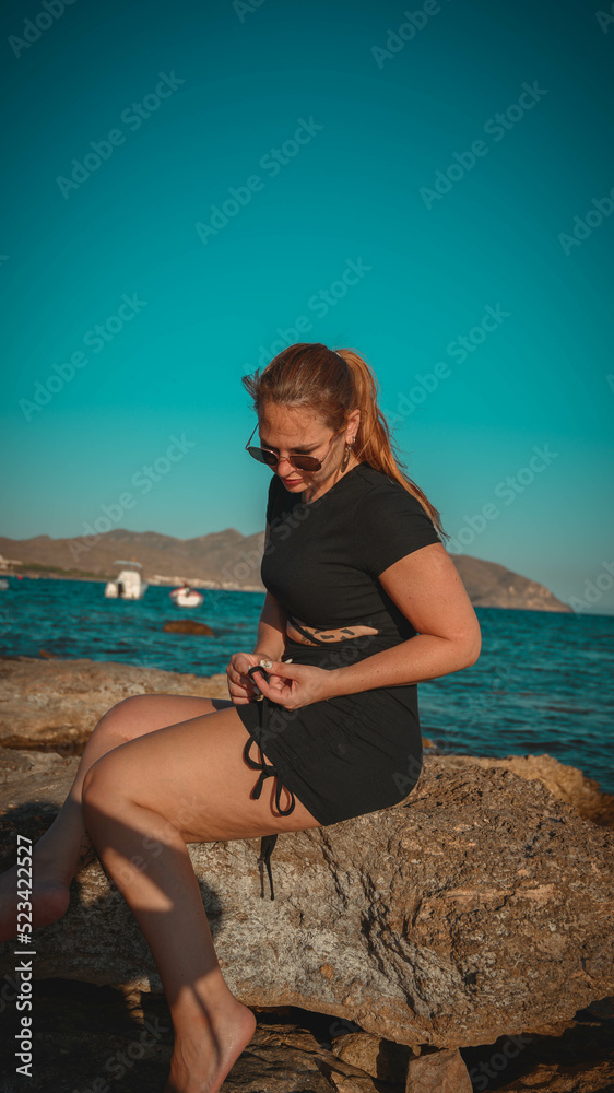 Mujer caucásica guapa joven con gafas de sol sentada en las rocas con el mar y el cielo azul de fondo #523422527