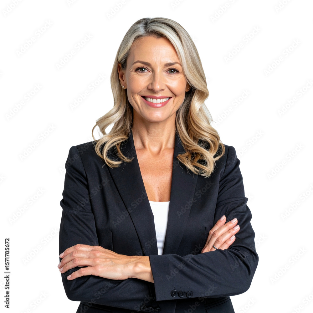 Mujer de negocios sonriente con brazos cruzados sobre fondo transparente.#1571785672