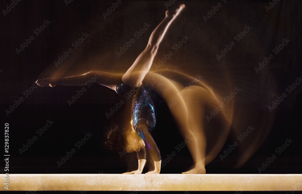 Multiple exposure image of female gymnast in motion on balance beam #129837820