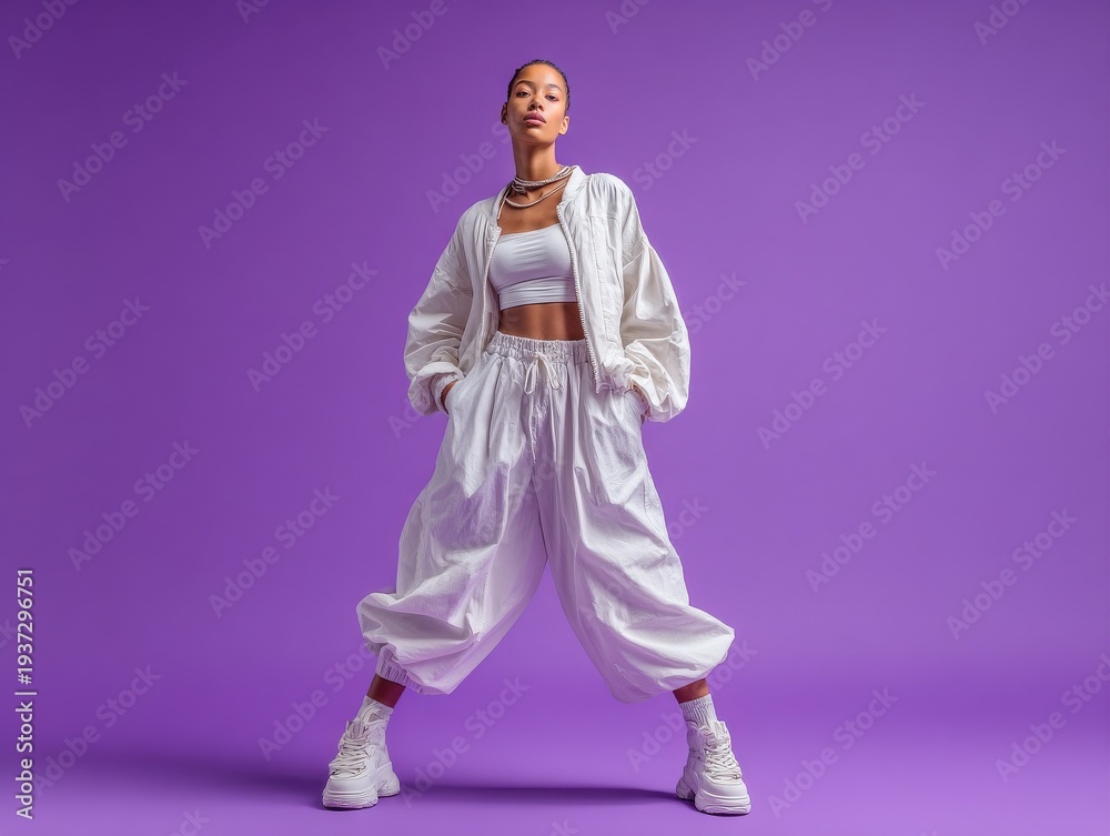 multiracial model in white minimalist outfit isolated on a purple background #1937296751