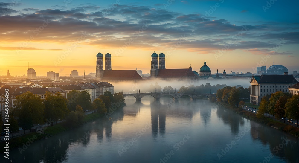 Munich Cityscape at Sunrise with Church Towers and River Reflection #1346965450