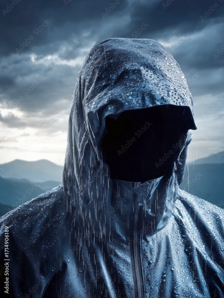 Mysterious Figure in Waterproof Jacket Stands in the Rain Against a Dramatic Mountain Backdrop #1714906189