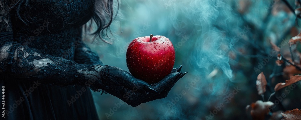 Mysterious witch in black offering a red apple representing temptation and poison, with a magical, foggy background evoking a fairy tale and Halloween atmosphere #966936301