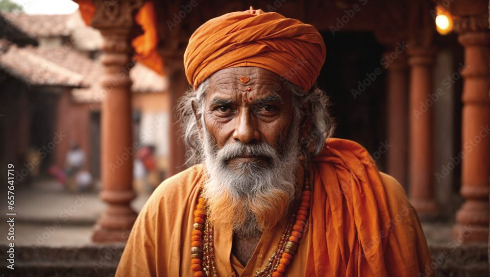 mystical hindu yogi man, temple in india, spiritual culture, traditional orange clothing, portrait #657641719