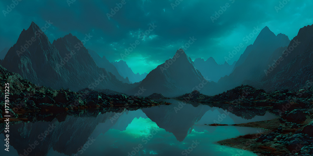 Mystical mountain range reflected in a calm lake under a dark, moody sky with a hint of turquoise light #1778711225