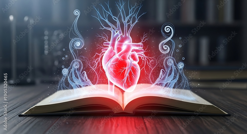 Mystical Revelation A Luminous, Branching Heart Ascends from an Open Book, Symbolizing Profound Medical Knowledge and the Secrets of Life #1905320465