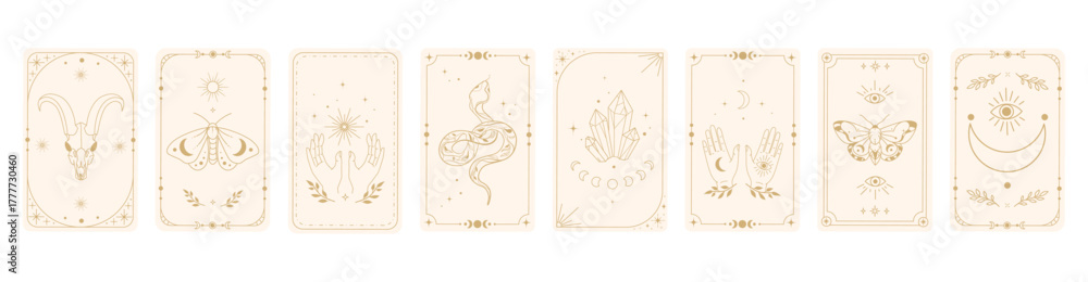 Mystical tarot design templates set with esoteric symbols goat skull, moths, snake, crystals, hands Boho style for branding, fortune telling decks, divination products, wall art, digital art. Vector #1777730460