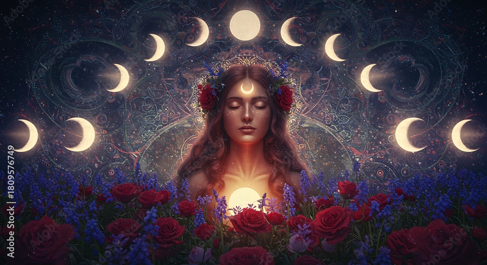 Mystical Woman with Moon Phases and Glowing Heart in a Floral Setting. #1809576749