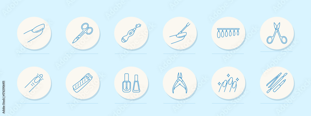 Nail care set icon. Circular line icons showing nail polish, clippers, scissors, cuticle tools, brushes, nail file, fingers, and sparkle effects in grooming-related symbols #1763906411