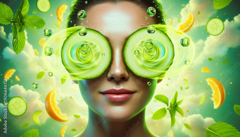 Natural Skincare and Wellness Concept with Woman Wearing Cucumber Eye Mask, Surrounded by Floating Organic Ingredients and Mint Leaves #1906646113