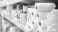 Neatly stacked rolls of white sterile gauze on a retail shelf for medical supplies #1882550493