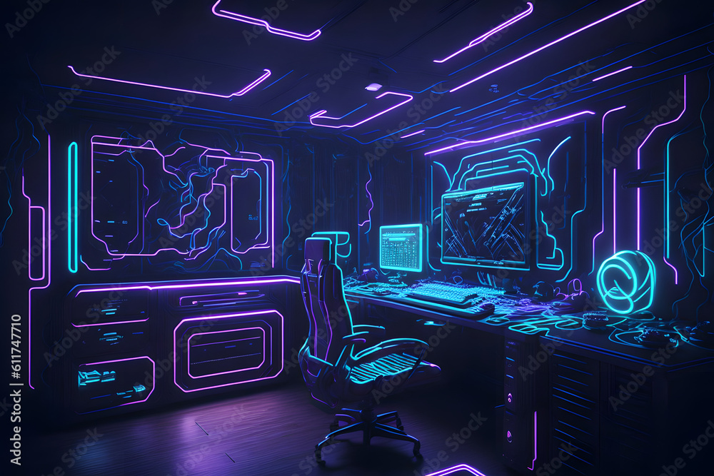 Neon futuristic glowing interior game room. Generative AI #611747710