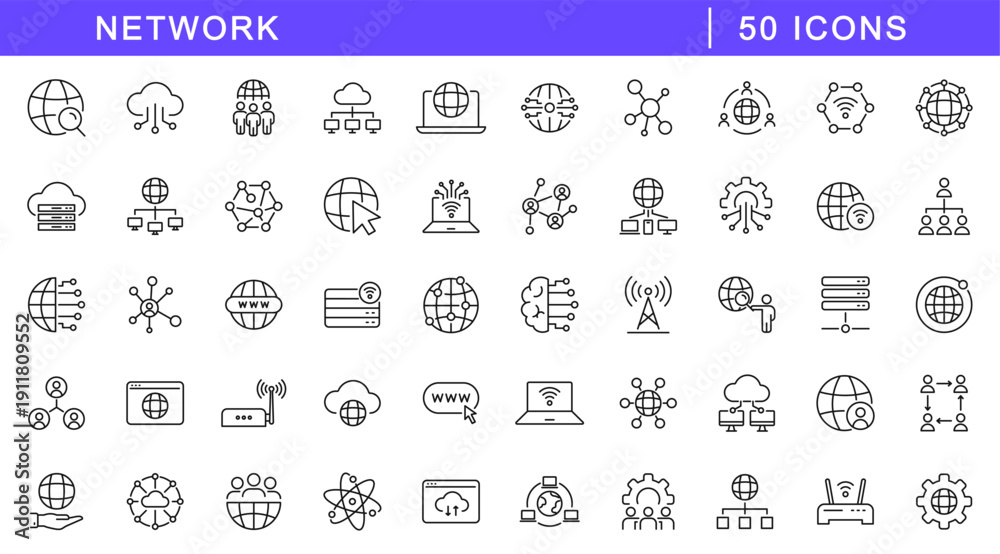 Network icon set. Networking icons in line style. Editable web icons internet, wireless, cloud computing, computer, communication, database, cyberspace, server, device, digital. Vector illustration. #1911809552