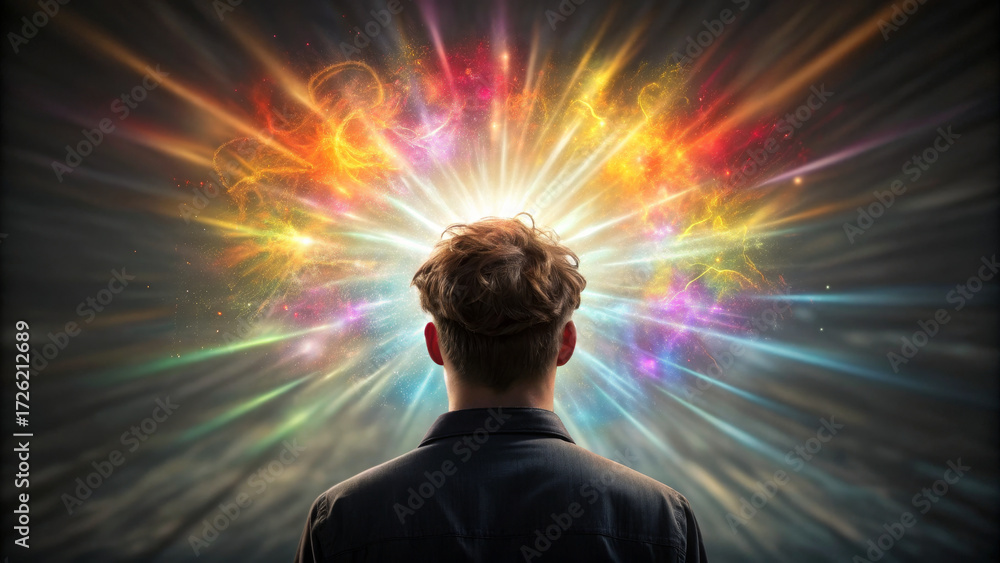 Neurodiversity concept ,young person with radiant colorful creative explosion from head expressing imagination and wonder #1726212689