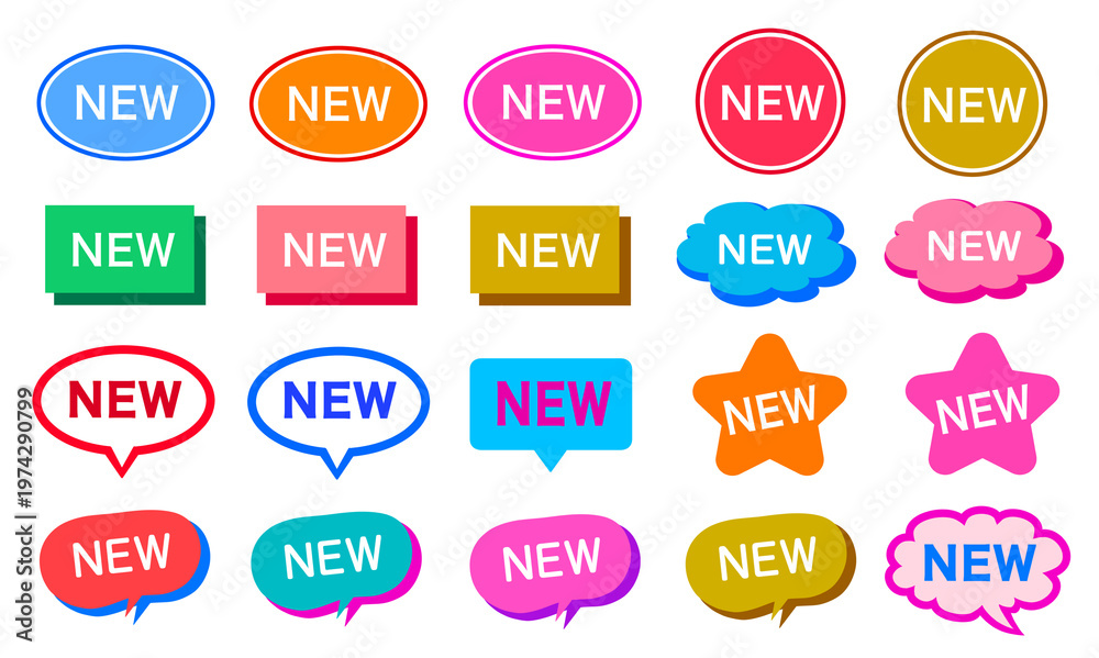 NEW あしらい セット 素材 見出し 飾り ポップ おしゃれ シンプル 吹き出し ワンポイント シール スタンプ Set of new arrival tag icon.Pop art style.badge, sticker, label,mark, symbol,button,speech bubble shape.sale sticker,price sticker #1974290799