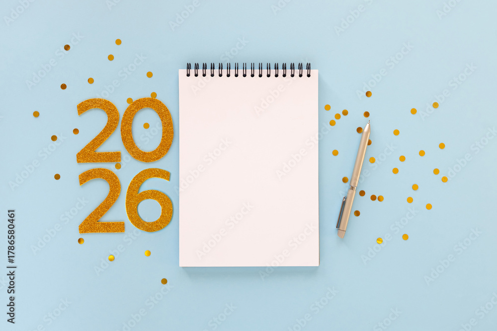 New Year 2026 planning concept with notebook and golden numbers for your goals, plans, resolutions. Flat lay style. Christmas planning concept with space for text #1786580461