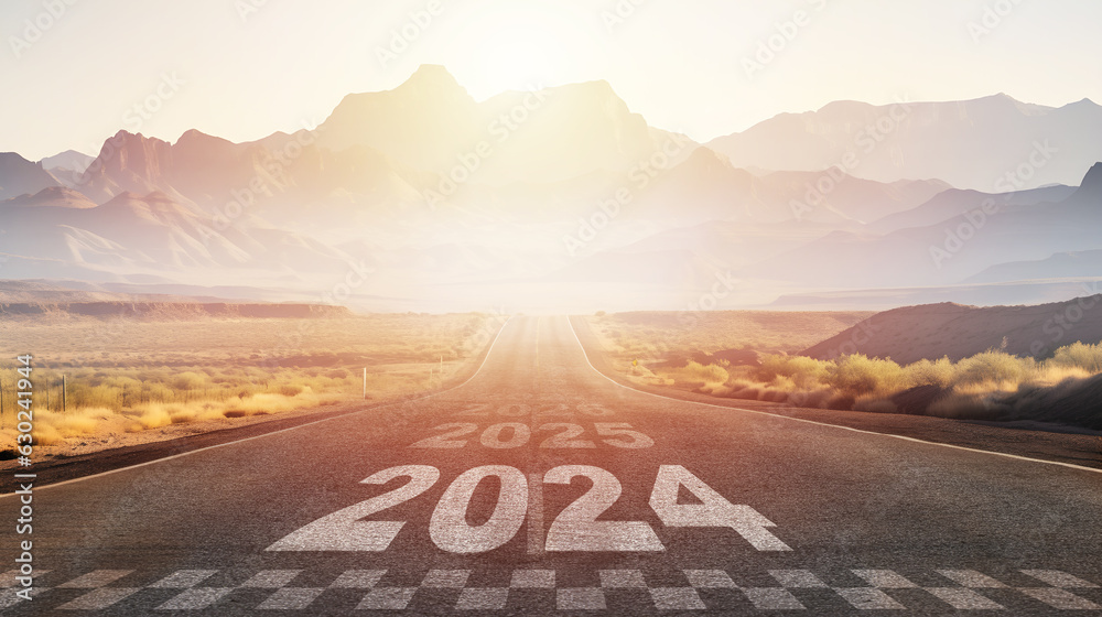 New year 2024, straightforward road trip travel and future vision of asphalt road at sunrise. Concept of planning, challenge, goal, and new year resolution. Generative AI #630241944