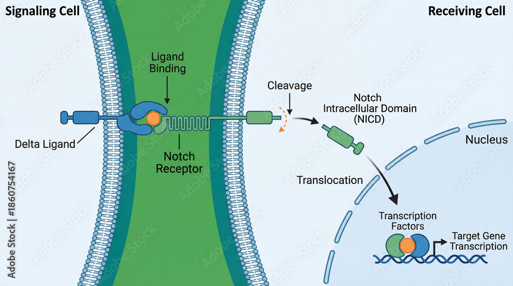 Notch receptor activation in cell signaling pathway with ligand binding at the membrane, proteolytic cleavage releasing the intracellular domain and its nuclear translocation for gene transcription; s #1860754167