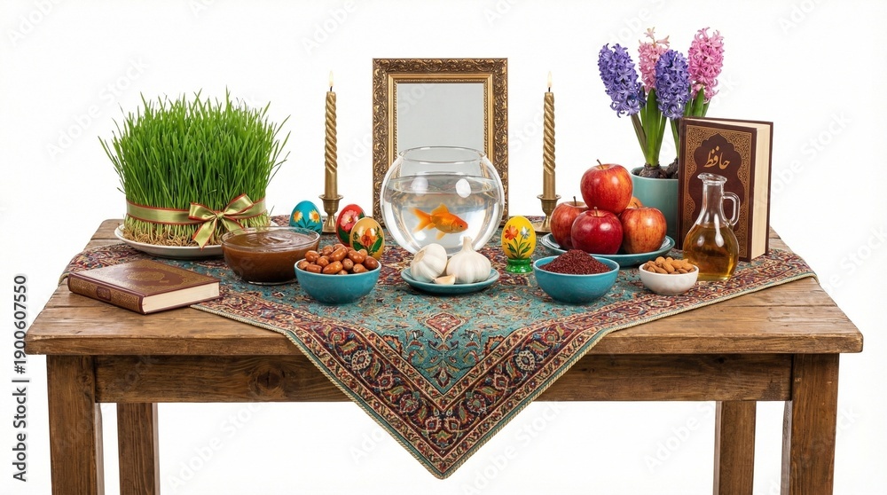 Nowruz haft sin table with goldfish bowl and spring hyacinths, rustic wooden setting for Persian New Year celebration, colorful symbols of renewal and family tradition #1900607550