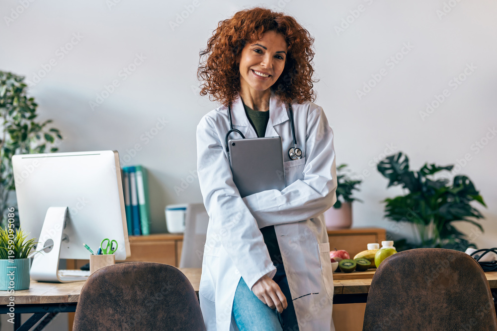 Nutritionist woman working with digital tablet while posing at camera in the nutritionist consultation #1959095086