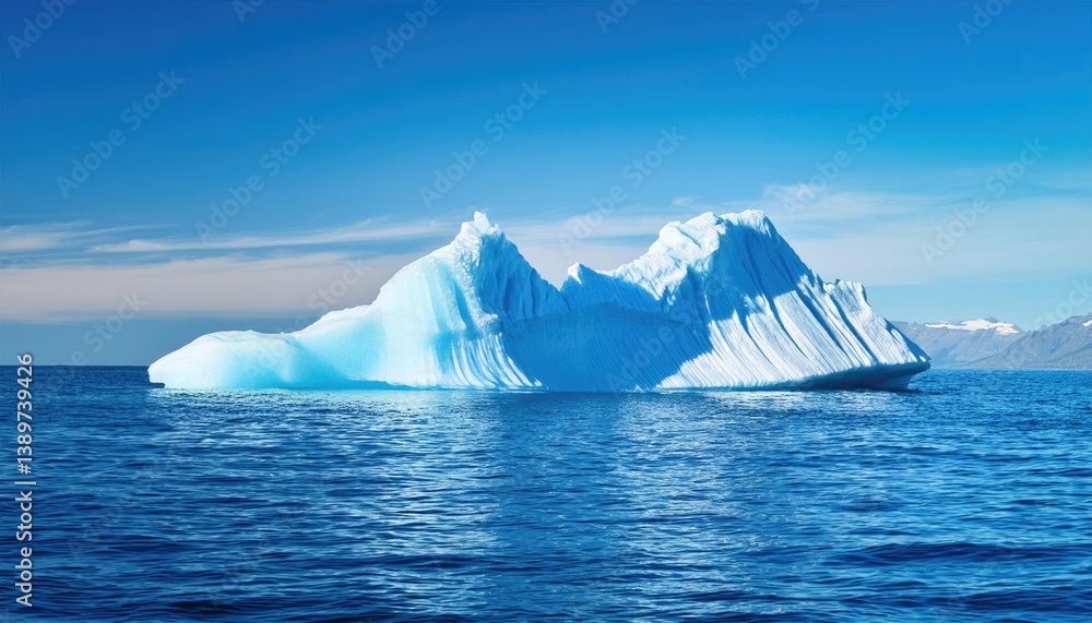 ocean coastline. massive iceberg floating in calm ocean waters, showcasing stunning blue hues #1389739426