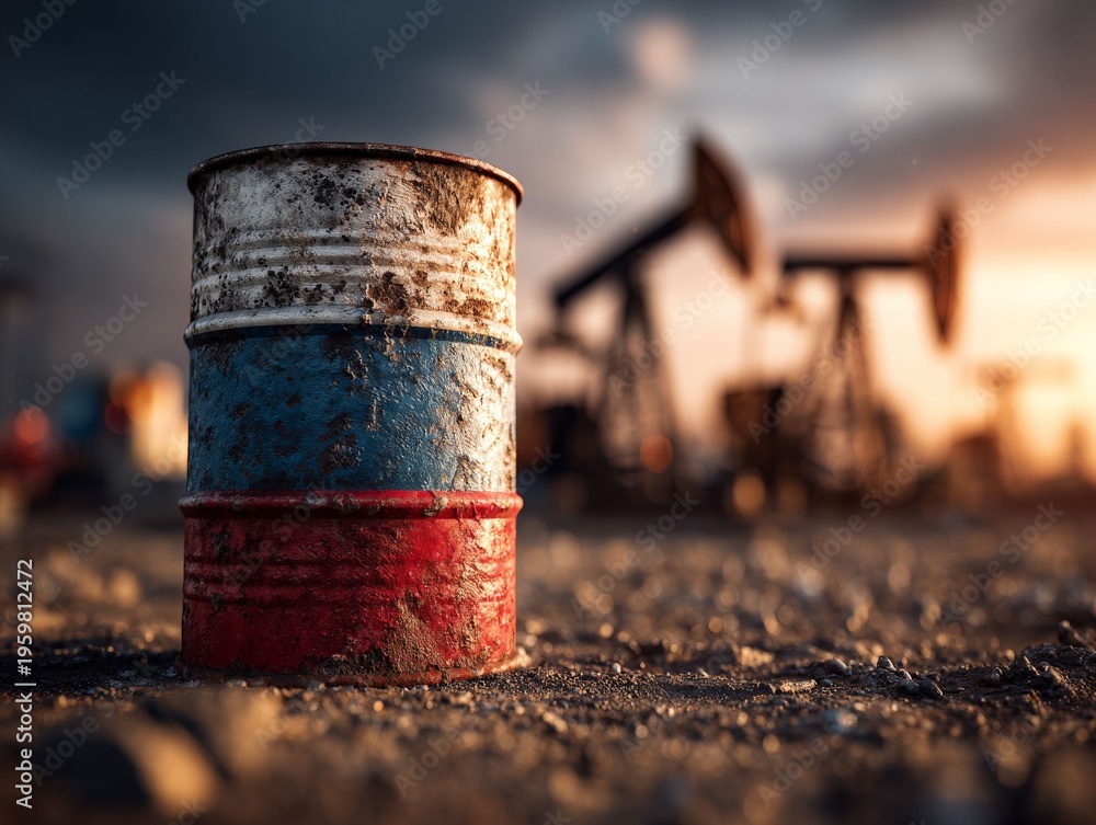 Oil Barrel and Oil Rig: An oil barrel, painted in the colors of the national flag, stands amidst an industrial landscape with oil rigs in the blurred background. #1959812472