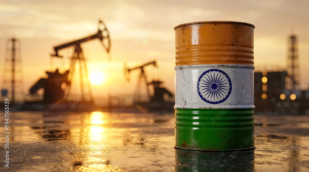 Oil barrel with India flag against refinery sunset background. Crude oil industry, energy production and energy trade concept. #1947165139