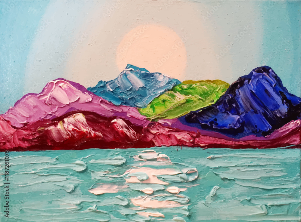 Oil painting of mountains, sun and sea. Art canvas. #1187261078