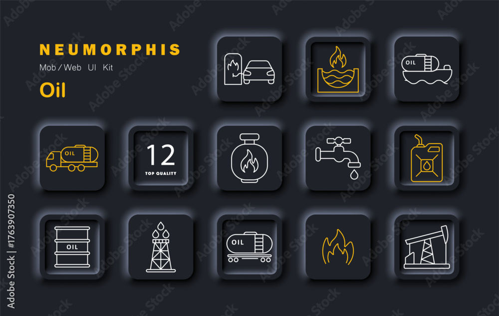 Oil set icon. Displays oil truck, barrel, pumpjack, fire, gas tap, tanker ship, jerrycan, refinery, drop, number badge #1763907350