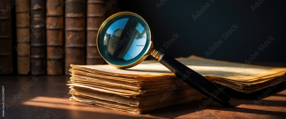 Old book and magnifying glass on a dark background representing knowledge and science. #1322340877