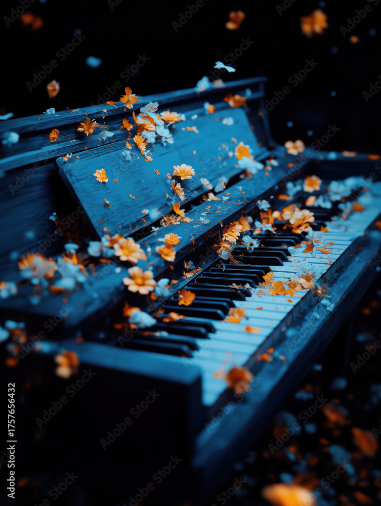 Old piano covered with orange and white petals under soft blue light. Emotional artistic composition symbolizing memory, nostalgia and beauty of decay #1757656432